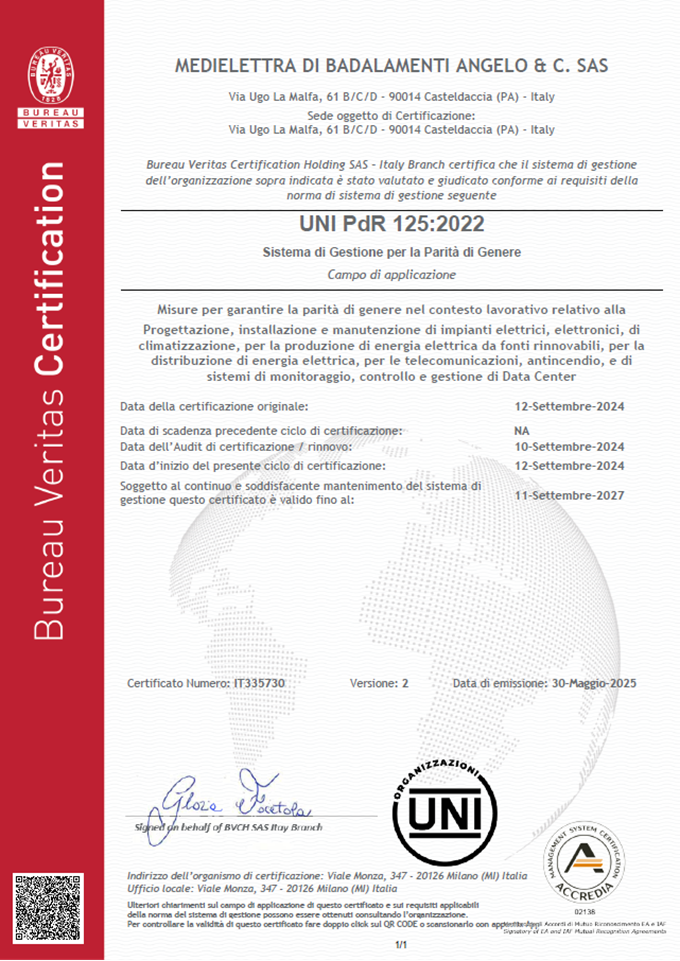 Certificato relativo alla gestione per la parità di genere in conformità alla norma UNI PdR 125:2022, per il seguente campo di applicazione: Progettazione, installazione e manutenzione di impianti elettrici, elettronici, di climatizzazione, per la produzione di energia elettrica da fonti rinnovabili, per la distribuzione di energia elettrica, per le telecomunicazioni, antincendio, e di sistemi di monitoraggio, controllo e gestione di Data Center.