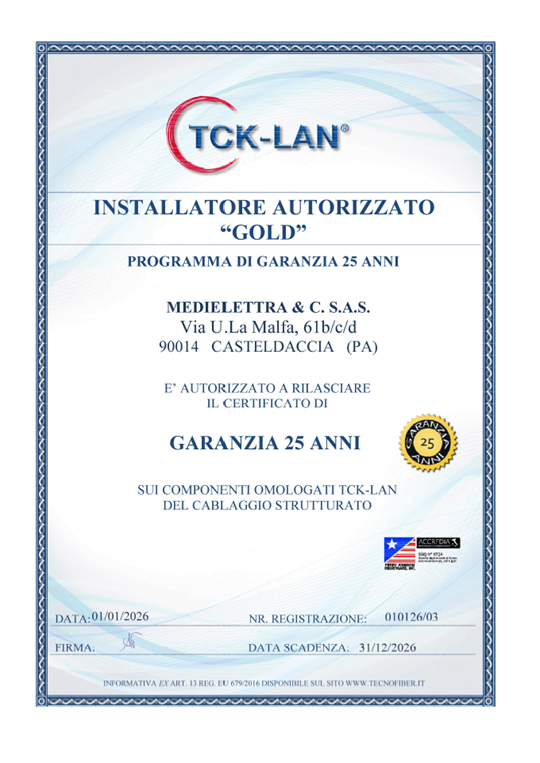 Autorizzazione a rilasciare il certificato di garanzia di 25 anni sui componenti omologati TCK-LAN del cablaggio strutturato.