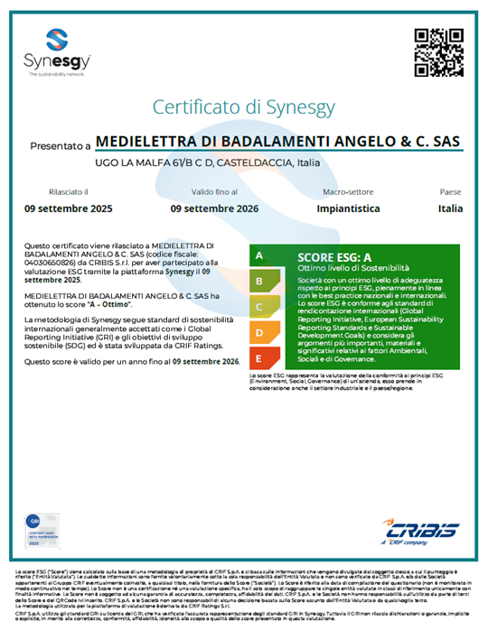 Certificato emesso secondo la metodologia di Synesgy, che segue standard di sostenibilità internazionali generalmente accettati come i Global Reporting Initiative (GRI) e gli obiettivi di sviluppo sostenibile (SDG). Medielettra presenta un ottimo livello di sostenibilità, essendo società riconosciuta con un ottimo livello di adeguatezza rispetto ai principi ESG, in linea con le best practice nazionali e internazionali. Lo score ESG è conforme agli standard di rendicontazione internazionali (Global Reporting Initiative, European Sustainability Reporting Standards e Sustainable Development Goals) e considera gli argomenti più importanti, materiali e significativi relativi ai fattori Ambientali, Sociali e di Governance.