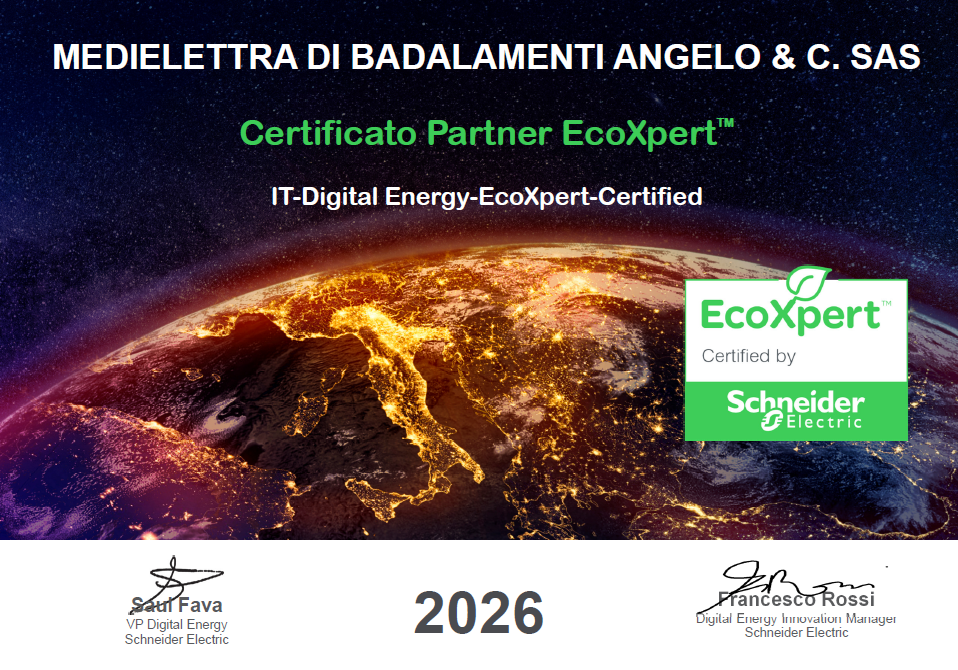 Certificazione EcoXpert di Schneider Electric per la realizzazione di soluzioni di Efficienza Energetica e l'offerta di servizi per il risparmio energetico.