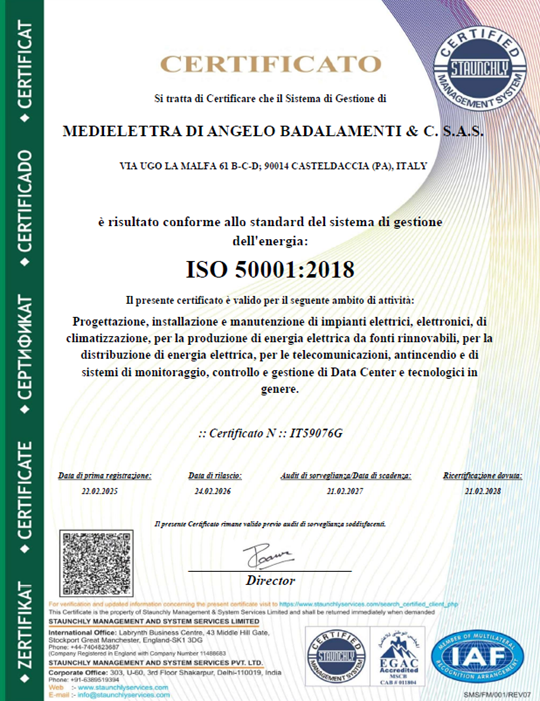 Certificato di gestione dell'energia in conformità alla norma ISO 50001:2018 per il seguente campo di applicazione: Progettazione, installazione e manutenzione di impianti elettrici, elettronici, di climatizzazione, per la produzione di energia elettrica da fonti rinnovabili, per la distribuzione di energia elettrica, per le telecomunicazioni, antincendio e di sistemi di monitoraggio, controllo e gestione di Data Center e tecnologici in genere.