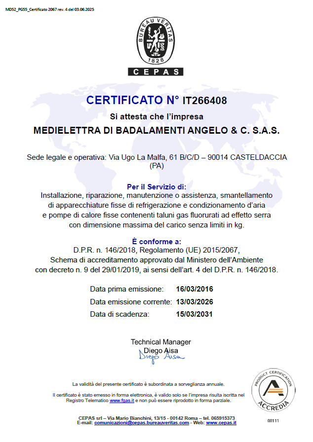 Installazione, riparazione, manutenzione o assistenza, smantellamento di apparecchiature fisse di refrigerazione e condizionamento d’aria e pompe di calore fisse contenenti taluni gas fluorurati ad effetto serra con dimensione massima del carico senza limiti in kg.