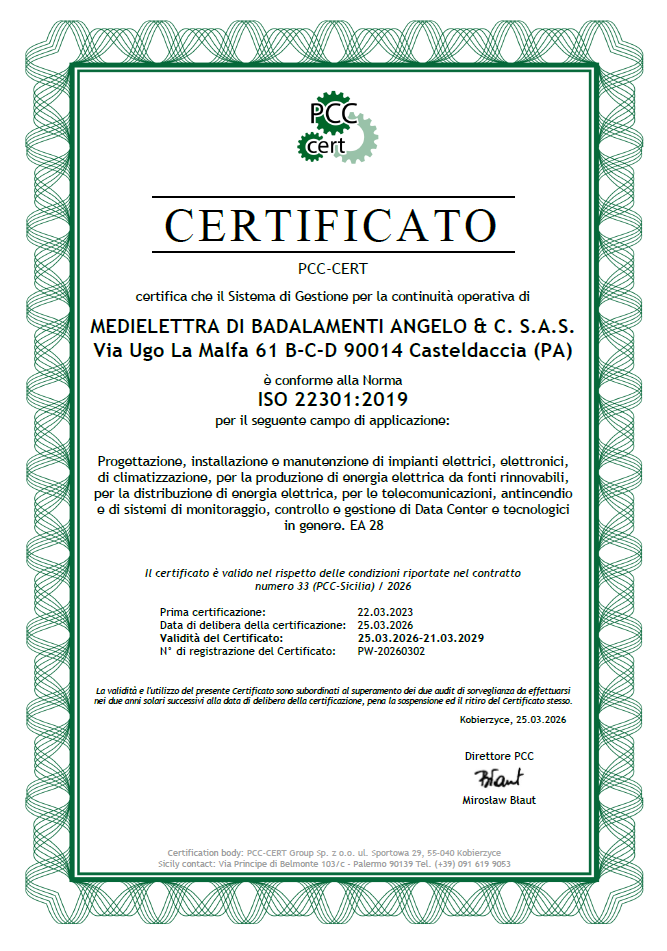 Certificato di gestione per la continuità operativa in conformità alla norma ISO 22301:2019 per il seguente campo di applicazione: Progettazione, installazione e manutenzione di impianti elettrici, elettronici, di climatizzazione, per la produzione di energia elettrica da fonti rinnovabili, per la distribuzione di energia elettrica, per le telecomunicazioni, antincendio e di sistemi di monitoraggio, controllo e gestione di Data Center e tecnologici in genere.