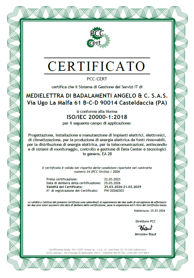 Certificato di gestione dei servizi IT in conformità alla norma ISO/IEC 20000-1:2018 per il seguente campo di applicazione: Progettazione, installazione e manutenzione di impianti elettrici, elettronici, di climatizzazione, per la produzione di energia elettrica da fonti rinnovabili, per la distribuzione di energia elettrica, per le telecomunicazioni, antincendio e di sistemi di monitoraggio, controllo e gestione di Data Center e tecnologici in genere.