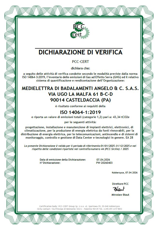 Dichiarazione di verifica delle emissioni di Gas ad Effetto Serra e del relativo sistema di quantificazione e rendicontazione in conformità alla norma ISO 14064-1:2019 per il seguente campo di applicazione: Progettazione, installazione e manutenzione di impianti elettrici, elettronici, di climatizzazione, per la produzione di energia elettrica da fonti rinnovabili, per la distribuzione di energia elettrica, per le telecomunicazioni, antincendio e di sistemi di monitoraggio, controllo e gestione di Data Center e tecnologici in genere.
