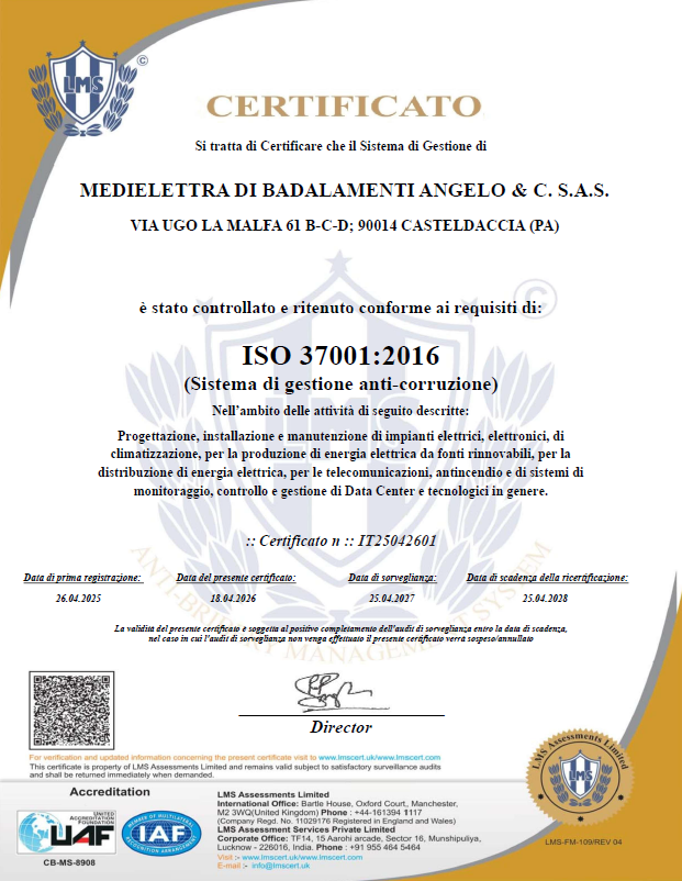Certificato di gestione per la prevenzione della corruzione in conformità alla norma ISO 37001:2016 per il seguente campo di applicazione: Progettazione, installazione e manutenzione di impianti elettrici, elettronici, di climatizzazione, per la produzione di energia elettrica da fonti rinnovabili, per la distribuzione di energia elettrica, per le telecomunicazioni, antincendio e di sistemi di monitoraggio, controllo e gestione di Data Center e tecnologici in genere.